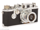 Leitz Wetzlar, Germany, 1950. Rangefinder camera 24x36mm, chrome, with Leitz Elmar 3.5/5cm No.200509 (C, cleaning marks on front element) and case. This camera has been upgraded to IIIf (with self timer) specifications. A piece of vulcanite is missing under the lens mount.