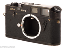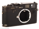 Leitz Canada, 1977-78. Rangefinder camera 24x36mm, black. Slow shutter speeds irregular, and flash synch post is missing. Nicks on base and top plate, and Minor pieces of vulcani-