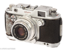 Otto Berning, Germany, 1950's. Rangefinder camera with spring winder, 24x36mm, with Nikkor 2.5/5cm No.360608 (C). Large parts of covering is missing and there's a dent on the top plate. Cleaning marks on front element of optics. The Nikkor-lens has been custom adapted from a Nikkorex 35, and is working well with the rangefinder.