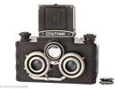 G.Barkovski, USSR Sovjet Union, 1950's-1970's. A bakelite camera for 6 stereo pictures 6x13cm on 120 film, with two Lomo T22 4.5/75mm No.063007 and front caps.